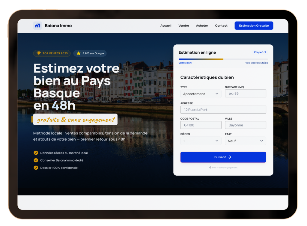 Une landing page bien conçue devient rapidement votre meilleur commercial digital : elle travaille 24h/24, capte des vendeurs potentiels même en dehors de vos heures d’ouverture, et filtre automatiquement les contacts sérieux. Dans un marché concurrentiel comme le Pays Basque, c’est un outil de différenciation majeur.